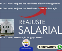 A Câmara Municipal realizou na manha desta quinta-feira(21), duas Sessões Extraordinárias, onde os vereadores apreciaram, votaram e aprovaram por unanimidade os 03 Projetos de Leis que constavam na pauta das referidas sessões, sendo um autoria deste Poder Legislativo Municipal e que trata do Reajuste de Servidores Efetivos do Legislativo, além dos dois Projetos de autoria do Executivo Municipal que tratam do Reajuste dos Servidores da Secretaria Municipal de Educação e da Restauração da Igreja Matriz.